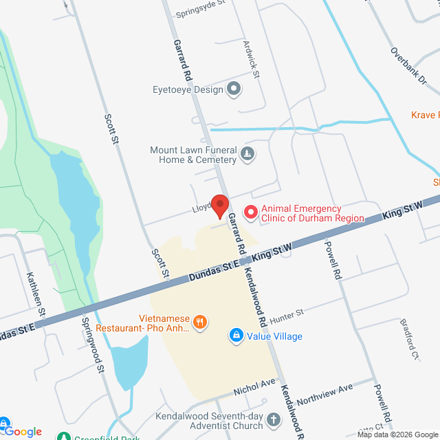 14 Garrard St. We are on the upper floor. Our office is located at the main intersection of Garrard and Dundas.